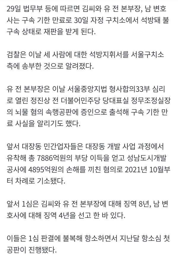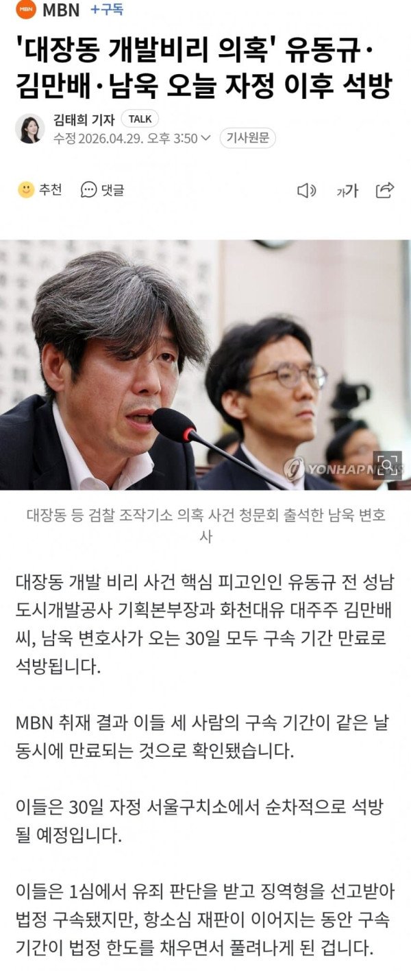 대장동 개발 비리 사건 핵심 피고인인 유동규 전 성남도시개발공사 기획본부장과 화천대유 대주주 김만배 씨, 남욱 변호사가 오는 30일 모두 구속 기간 만료로 석방됩니다. MBN 취재 결과 이들 세 사람의 구속 기간이