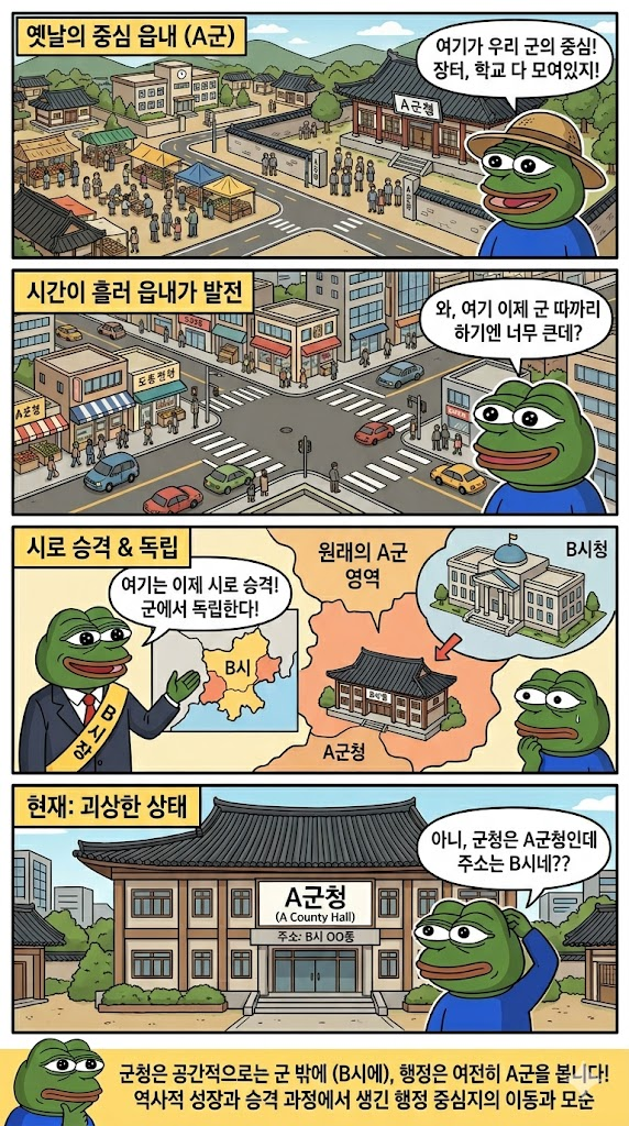 군청이 군 밖에 있는 케이스는 예전 한국에서 은근 자주 있던 일들이었습니다