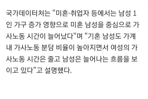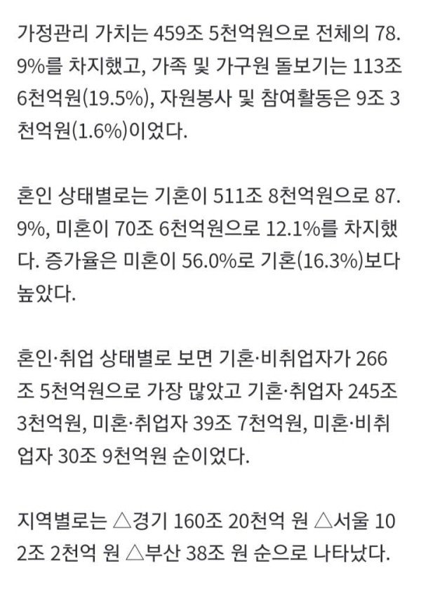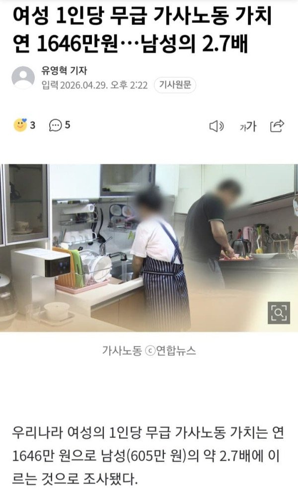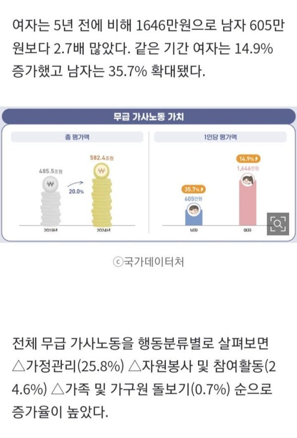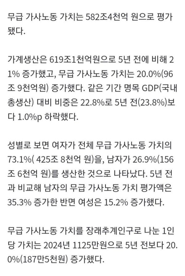 우리나라 여성의 1인당 무급 가사노동 가치는 연 1646만 원으로 남성(605만 원)의 약 2.7배에 이르는 것으로 조사됐다. 29일 국가데이터처가 발표한 '2024년 가계생산위성계정 결과'에 가계 내 생산활동에 대