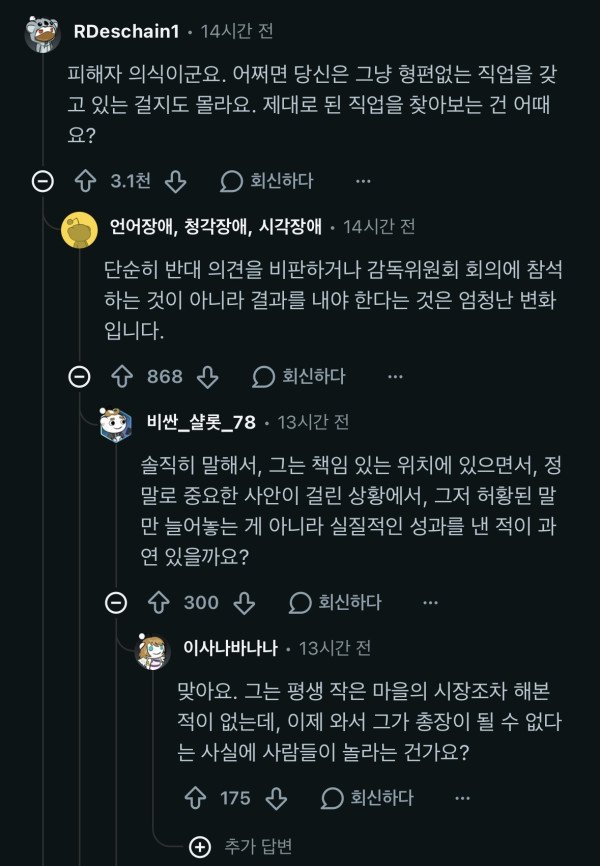 요약: 누가 총리되라고 칼들고 협박햇노? 피해자코스프레 그만하고 직업이 적성에 안맞으면 때려치든가