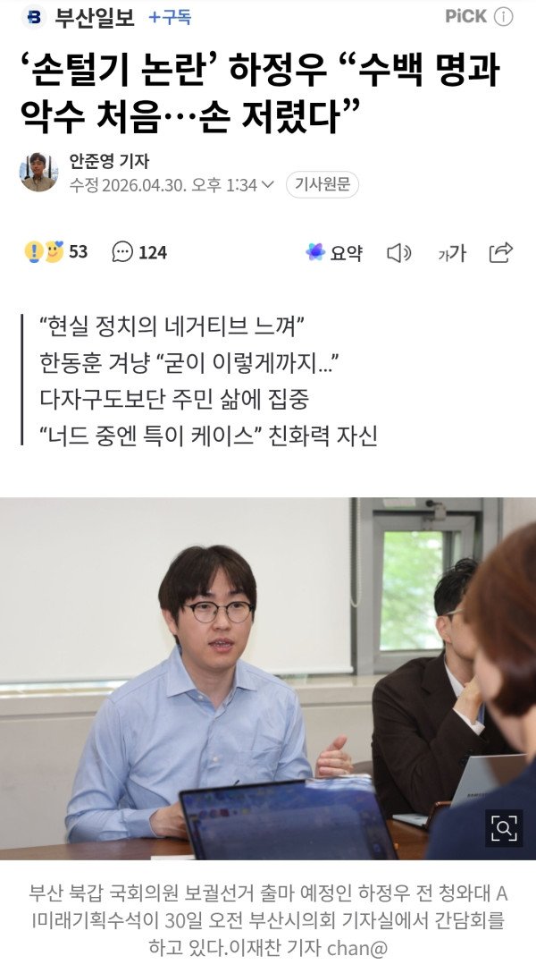 부산 북갑 보궐선거 출마를 선언한 하정우 전 청와대 AI미래기획수석이 전날 구포시장 유세에서 터져나온 이른바 ‘손털기’ 논란에 “손이 저리다 보니 무의식 중에 쳤다”고 해명했다. ‘시근’(분별력) 가진 사람이라면 그