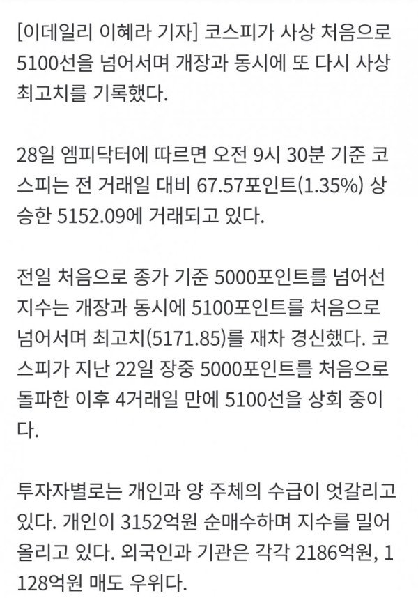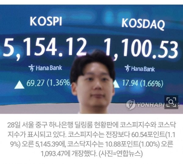 • 한국 증시가 연일 상승세를 이어가며 코스피는 장중 사상 처음으로 5100선을 돌파했고, 코스닥 지수 역시 1100선을 넘어서며 역대 최고치를 다시 썼다.