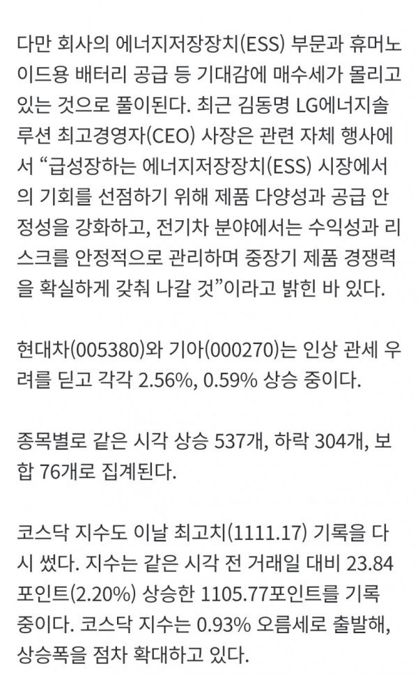 • 개장과 동시에 코스피는 5100선을 상회하며 전일 종가 기준 5000선 돌파에 이어 또다시 최고치를 경신했으며, 시가총액 상위 종목 중 삼성전자와 SK하이닉스는 실적 기대감에, LG에너지솔루션은 ESS 및 로봇용 배터리 공급 기대감에 급등세를 보였다.