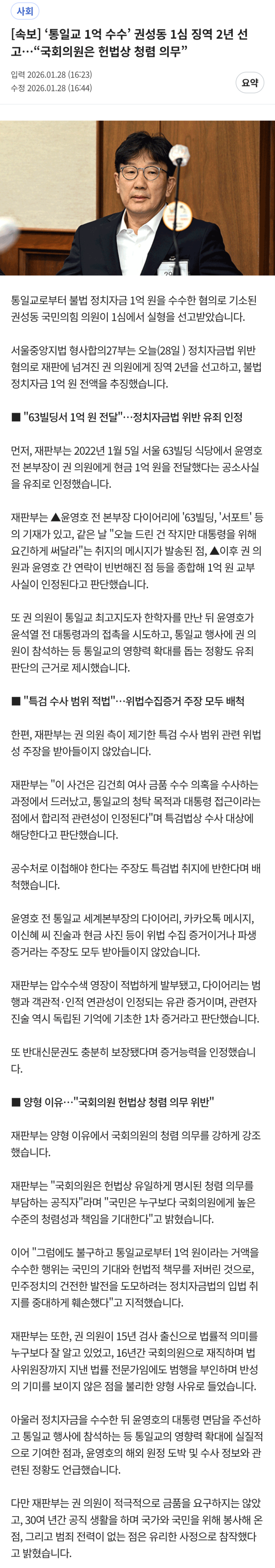 권성동 1심 징역 2년 선고…“국회의원은 헌법상 청렴 의무”