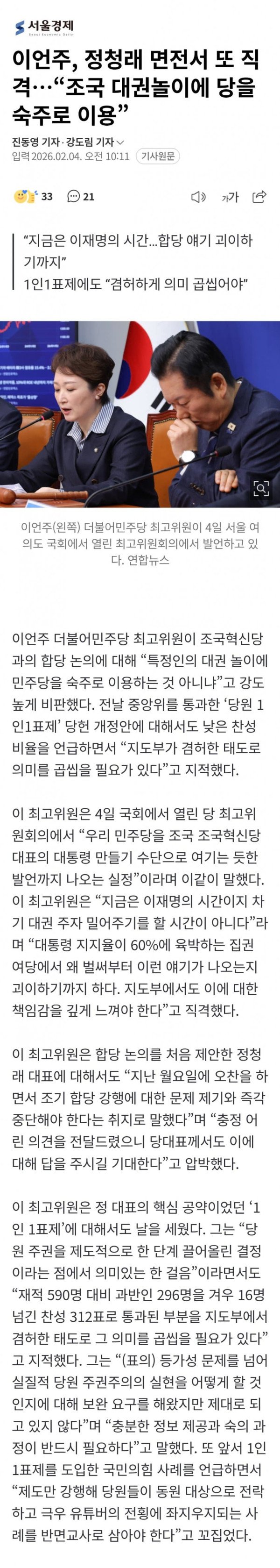 이언주 더불어민주당 최고위원이 조국혁신당과의 합당 논의에 대해 “특정인의 대권 놀이에 민주당을 숙주로 이용하는 것 아니냐”고 강도 높게 비판했다. 전날 중앙위를 통과한 ‘당원 1인1표제’ 당헌 개정안에 대해서도 낮은