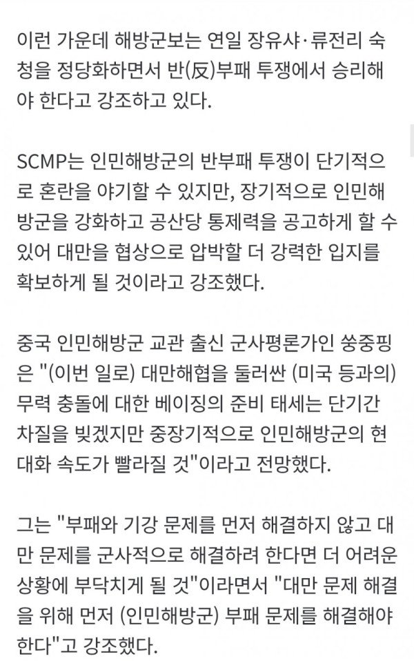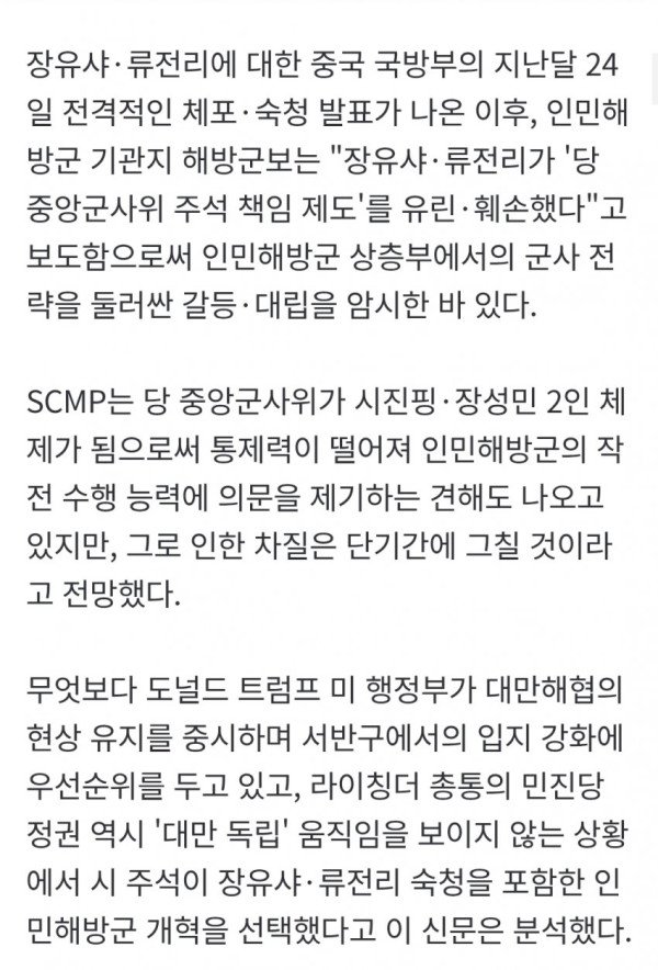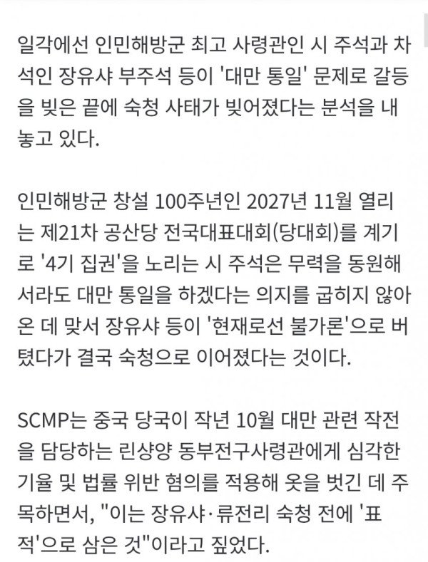 • SCMP는 장유샤와 류전리 숙청 이전에 대만 관련 작전을 담당하는 린샹양 동부전구사령관을 먼저 표적으로 삼았던 점에 주목하며, 이는 숙청의 사전 작업이었음을 시사한다.