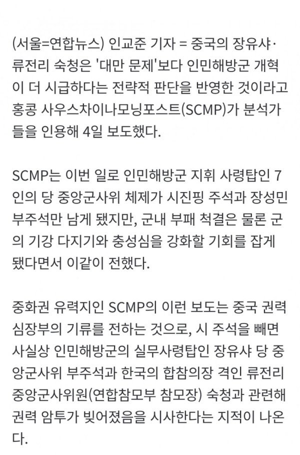 • 홍콩 사우스차이나모닝포스트(SCMP)는 중국의 장유샤 및 류전리 숙청이 대만 문제보다 인민해방군 개혁이 더 시급하다는 전략적 판단을 반영한 것이라고 분석가들을 인용해 보도했다.