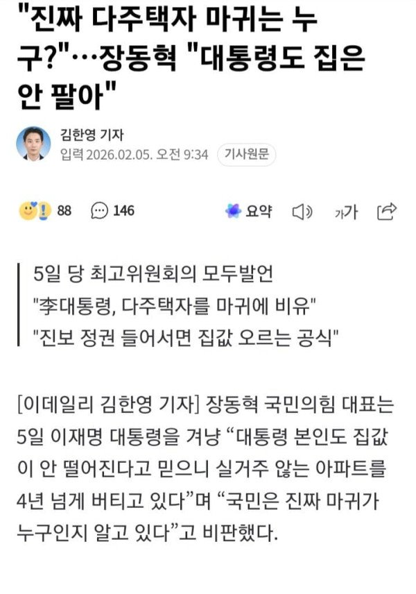 "진짜 다주택자 마귀는 누구?"…장동혁 "대통령도 집은 안 팔아"