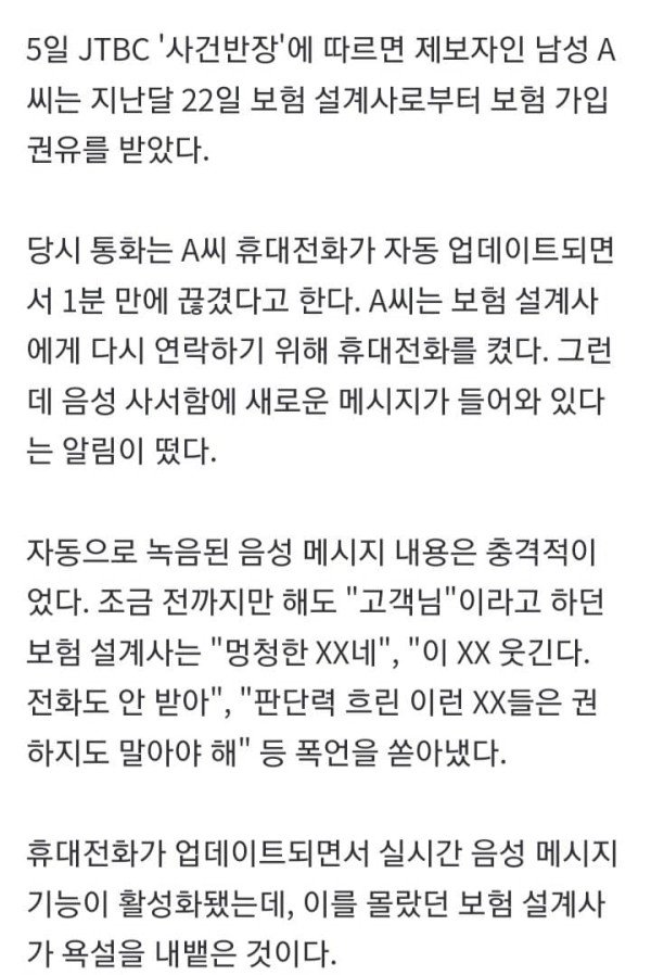 보험 상담을 받던 고객이 전화가 끊긴 뒤 보험 설계사로부터 폭언을 들었다는 사연이 전해졌다. 5일 JTBC '사건반장'에 따르면 제보자인 남성 A씨는 지난달 22일 보험 설계사로부터 보험 가입 권유를 받았다. 당시