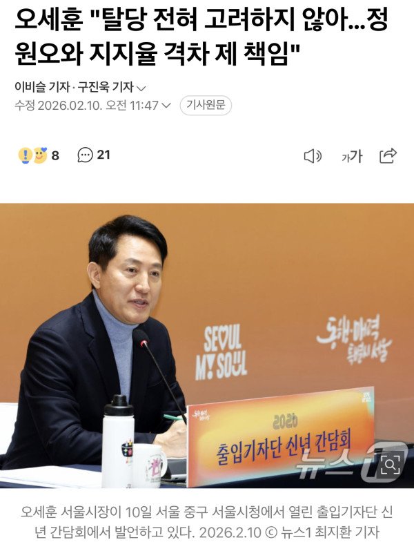 오 시장은 이날 오전 서울시청에서 열린 2026년 출입기자단 신년 기자간담회에서 '국민의힘 내홍이 깊어지고 있다'는 취지의 질문과 함께 탈당 가능성에 관한 입장을 밝혀달라는 말에 대해 이같이 답했다.