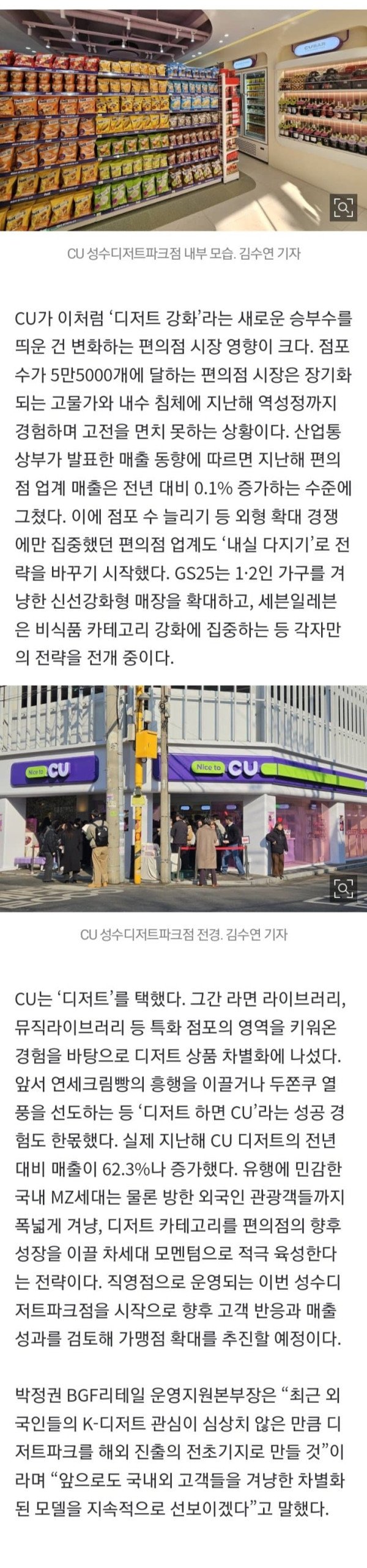 CU, 성수동에 국내 최초 디저트 특화 점포 오픈 상품·공간·체험 결합한 새로운 편의점 모델 제시 디저트군 30% 강화…인기 디저트 큐레이션존도 ‘포화’ 편의점업계, 작년 매출 성장률 0.1% ‘고전’ CU, 외국인