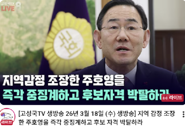 고성국씨와 손잡고 다른 후보들을 찍어 누르는 것이 당신들이 말하는 공정입니까? 대구를 ‘윤어게인’식 소모전의 무대로 만들고, 몇몇이 설계하는 정치 투견장으로 전락시키는 행태는 혁신이 아닙니다. 명백한 해당(害黨) 행위입니다.
