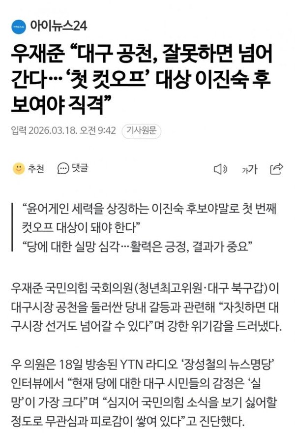 우재준 국민의힘 국회의원(청년최고위원·대구 북구갑)이 대구시장 공천을 둘러싼 당내 갈등과 관련해 “자칫하면 대구시장 선거도 넘어갈 수 있다”며 강한 위기감을 드러냈다. 우 의원은 18일 방송된 YTN 라디오 ‘장성철