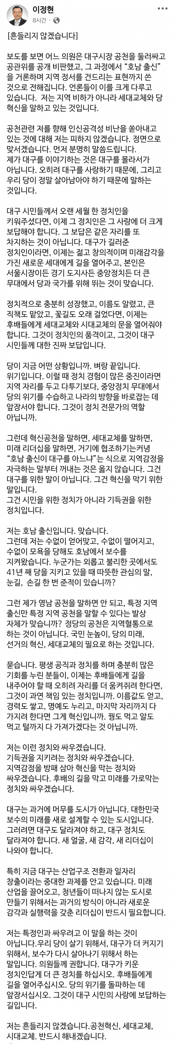 이정현 페북 "대구 중진들, 이제는 큰 정치 해야"