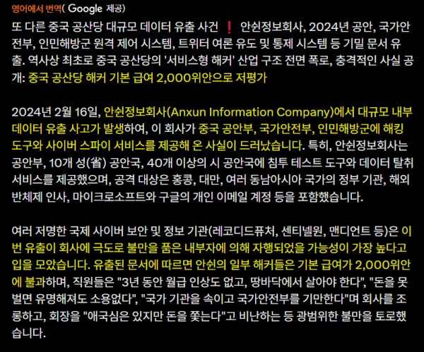 돈안줘서 삐친 짱깨해커가 유출한 정보