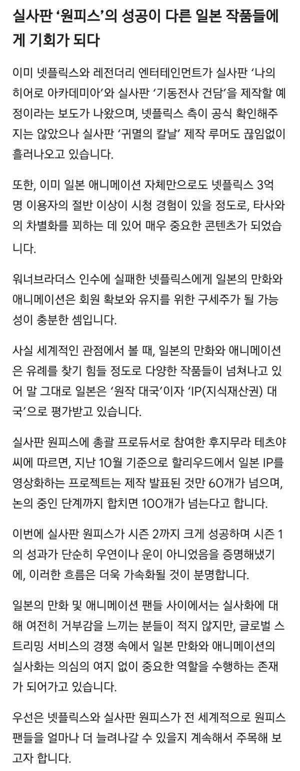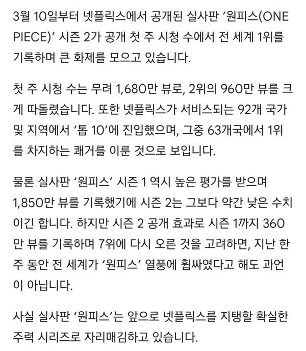 실사판 원피스2도 전 세계 1위 출발...넷플릭스 구원할까?