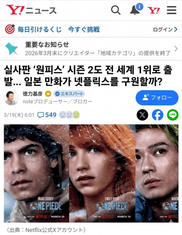 実写版「ONE PIECE」シーズン2も世界1位スタート。日本のマンガがNetflixを救う?(徳力基彦) - エキスパート - Yahoo!ニュース