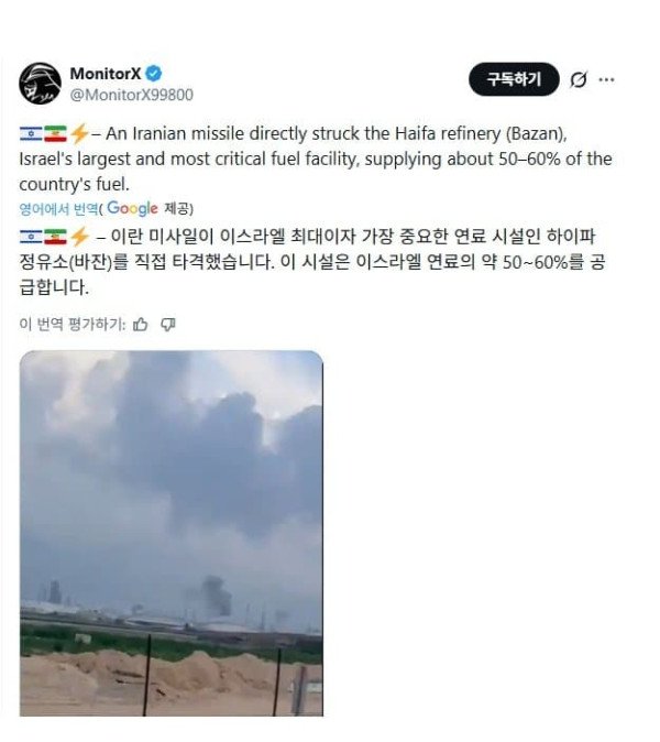 ㅁㄱ)이스라엘 최대 정유시설 공격당함