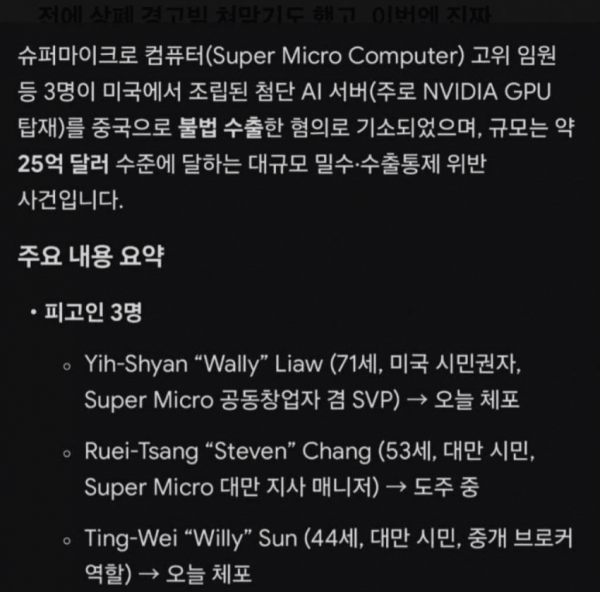슈퍼마이크로 측은 "해당 직원들을 직무에서 배제하고 계약을 해지했다"며 "회사 정책과 수출 규정을 위반한 개인적 일탈"이라고 선을 그었다.