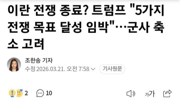 이란 전쟁 종료? 트럼프 "5가지 전쟁 목표 달성 임박"…군사 축소 고려