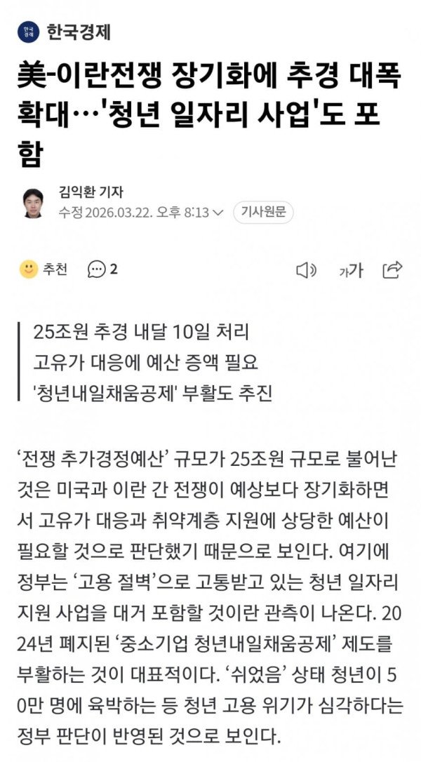 美-이란전쟁 장기화에 추경 대폭 확대…'청년 일자리 사업'도 포함