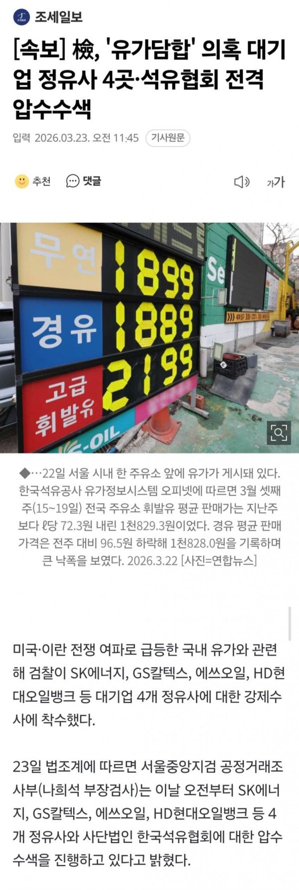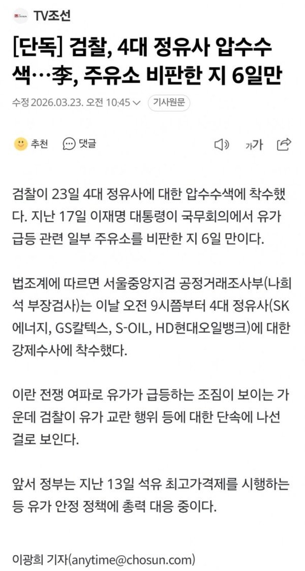 검찰이 23일 4대 정유사에 대한 압수수색에 착수했다. 지난 17일 이재명 대통령이 국무회의에서 유가 급등 관련 일부 주유소를 비판한 지 6일 만이다. 법조계에 따르면 서울중앙지검 공정거래조사부(나희석 부장검사)는