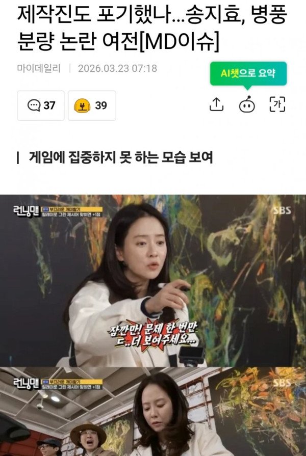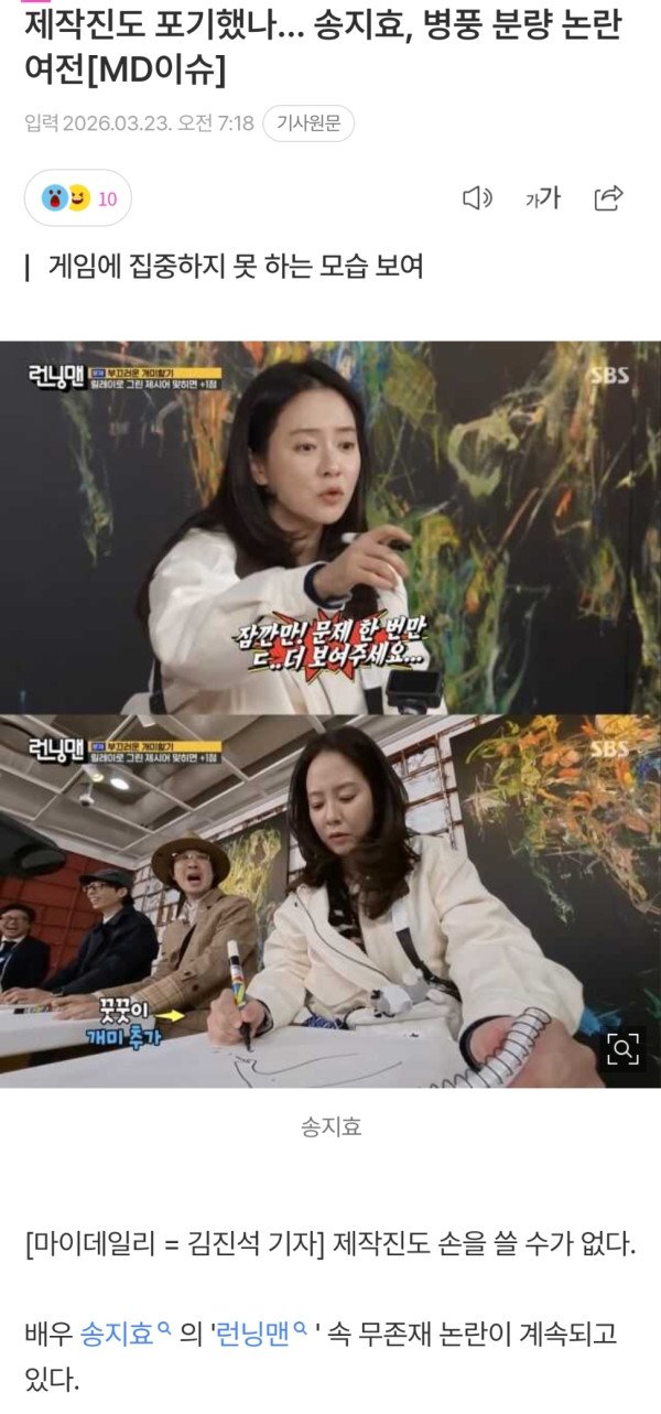 뉴스기사) '런닝맨'서 입꾹닫 송지효, 병풍 논란 재점화