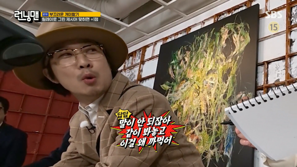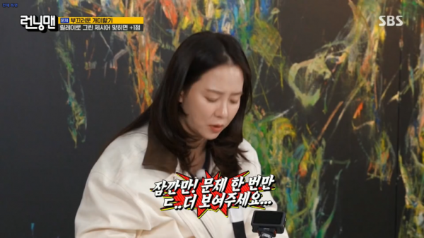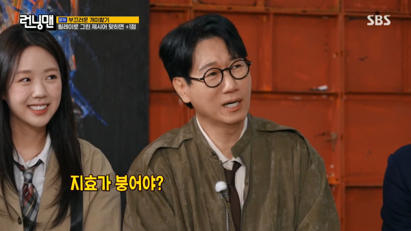 릴레이로 그린 제시어를 맞히는 게임 도중 송지효는 "문제 한 번 더 보여달라"고 했다. 김종국은 "문제를 안 봤냐"고 소리쳤고 지석진도 "3초 전에 보여줬는데…"라며 "지효가 붕어야?"라고 했다. 하하는 "말이 안 되잖아. 같이 봐놓고"라고 구박했다. 진짜 집중하지 않아서인지 재미를 위해 일부러 의도한건지 이유는 알 수 없지만 웃음을 주진 못 했다.