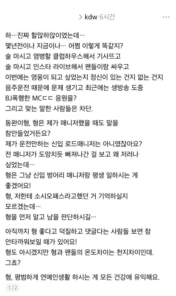 스레드에 김동완 전 매니저라고 주장하는 사람 글