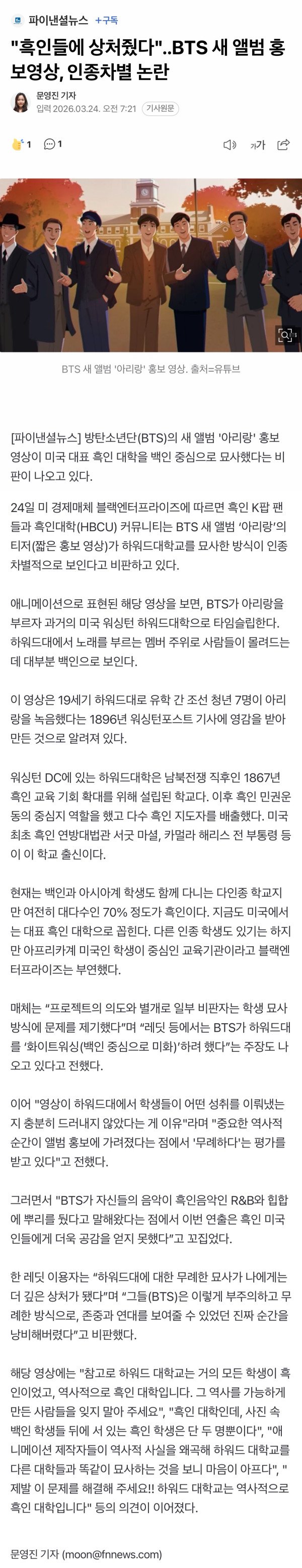 방탄소년단(BTS)의 새 앨범 '아리랑' 홍보 영상이 미국 대표 흑인 대학을 백인 중심으로 묘사했다는 비판이 나오고 있다. 24일 미 경제매체 블랙엔터프라이즈에 따르면 흑인 K팝 팬들과 흑인대학(HBCU) 커뮤니티는