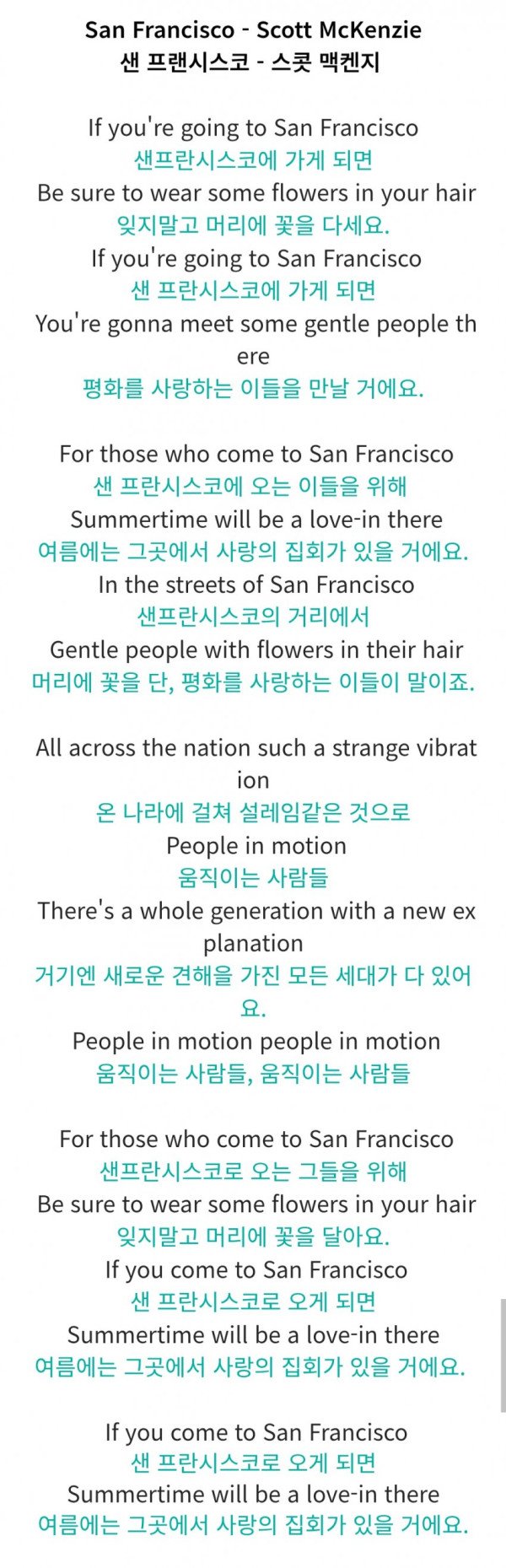이 곡은 1967년 발표한 스콧매킨지의 <샌프란시스코>로 60년대 반전운동과 히피의 평화주의를 담고있습니다