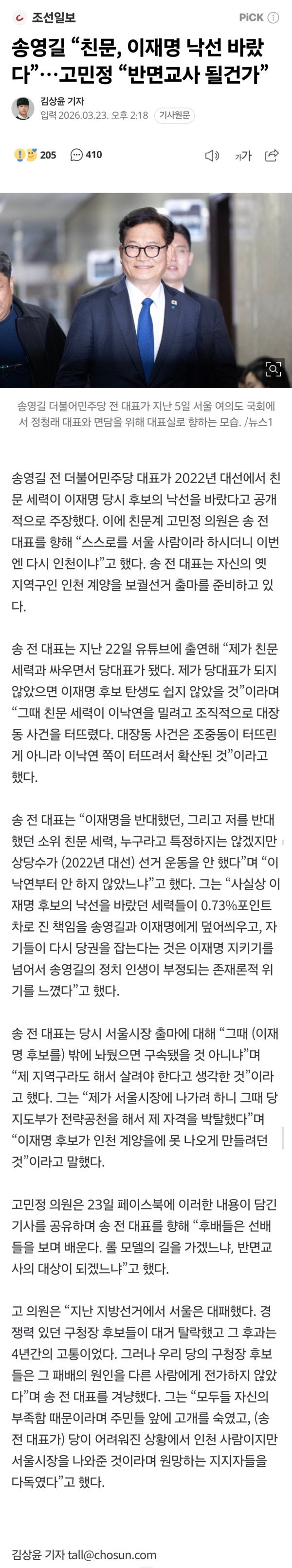 송영길 전 더불어민주당 대표가 2022년 대선에서 친문 세력이 이재명 당시 후보의 낙선을 바랐다고 공개적으로 주장했다. 이에 친문계 고민정 의원은 송 전 대표를 향해 “스스로를 서울 사람이라 하시더니 이번엔 다시 인