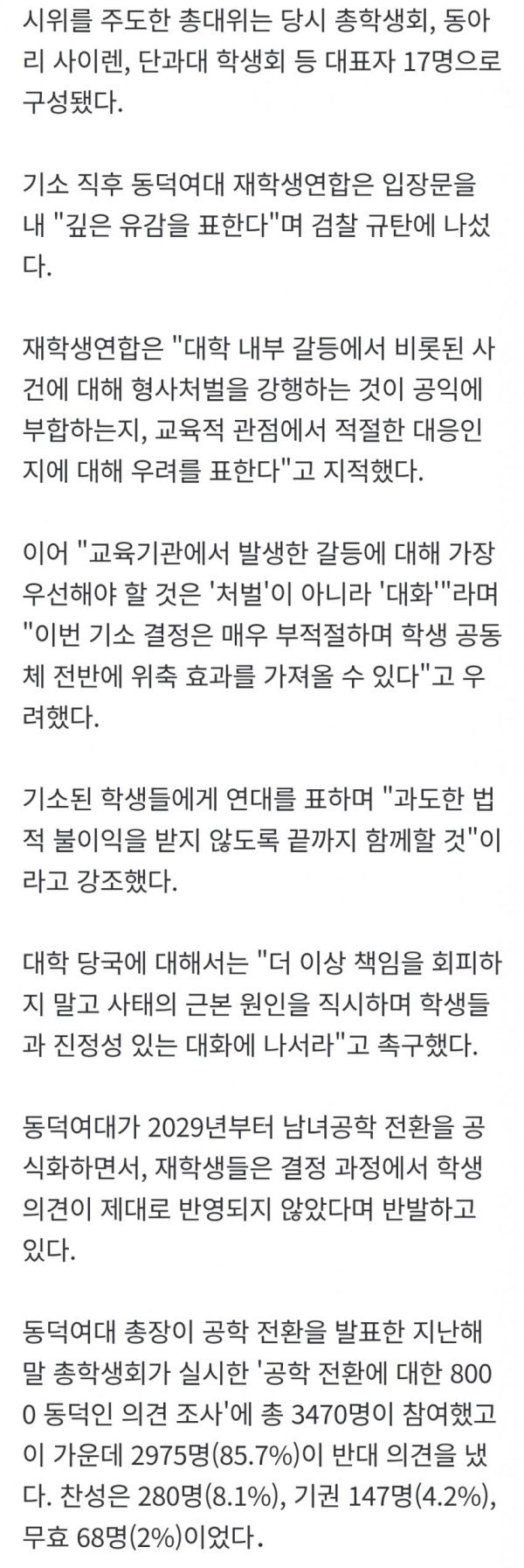 동덕여대의 남녀공학 전환 논의에 반발해 교내 점거 농성을 벌였던 재학생들이 재판에 넘겨졌다. 학교 측이 고소를 취하했지만 업무방해와 재물손괴 등 혐의에 관한 수사가 진행되면서 결국 기소로 이어졌다. 25일 법조계 등