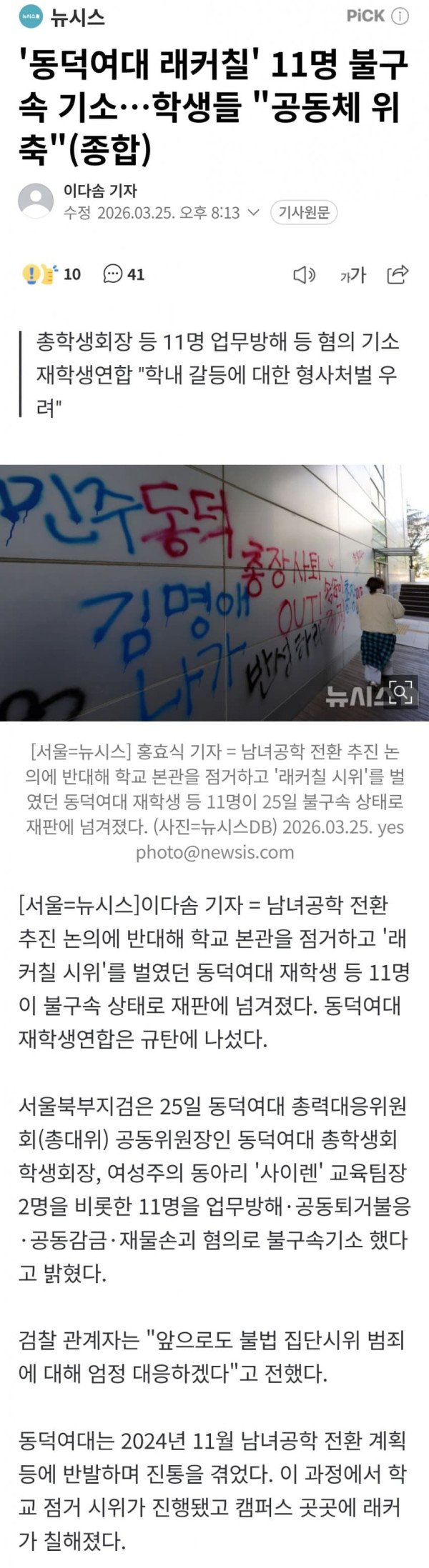 [속보] 검찰, 동덕여대 '래커칠 시위' 학생 등 11명 불구속 기소