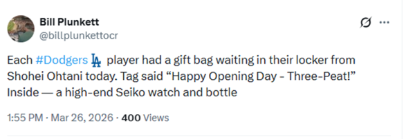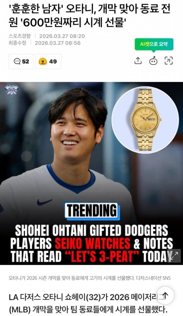 LA 다저스 오타니 쇼헤이(32)가 2026 메이저리그(MLB) 개막을 맞아 팀 동료들에게 시계를 선물했다.