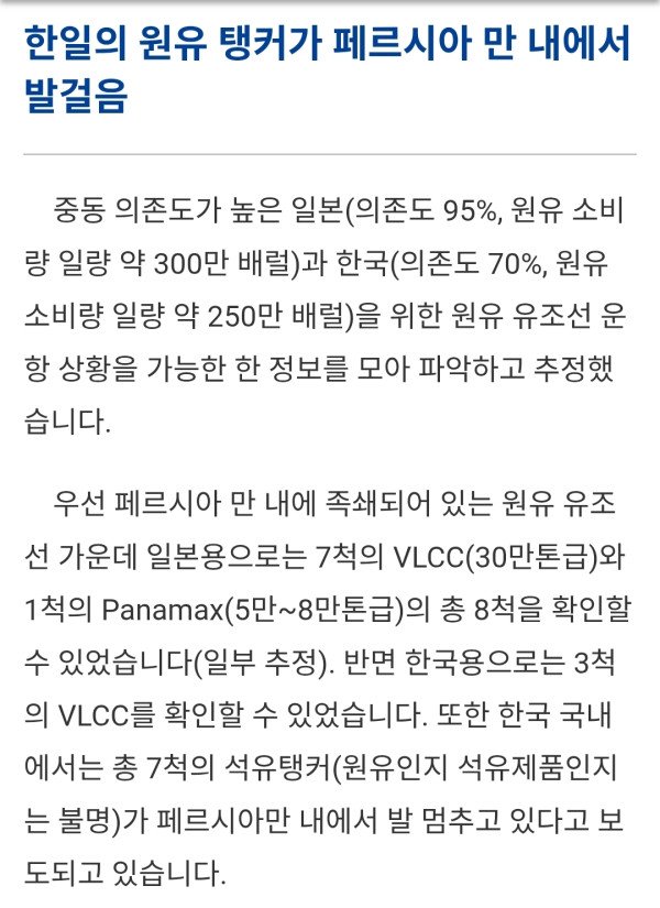 中東依存度が高い日本(依存度95%、原油消費量日量約300万バレル)と韓国(依存度70%、原油消費量日量約250万バレル)向けの原油タンカー運航状況を、可能な限りの情報を集めて把握し、推定しました。 まずペルシャ湾内に足止めされている原…