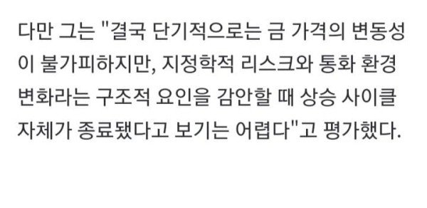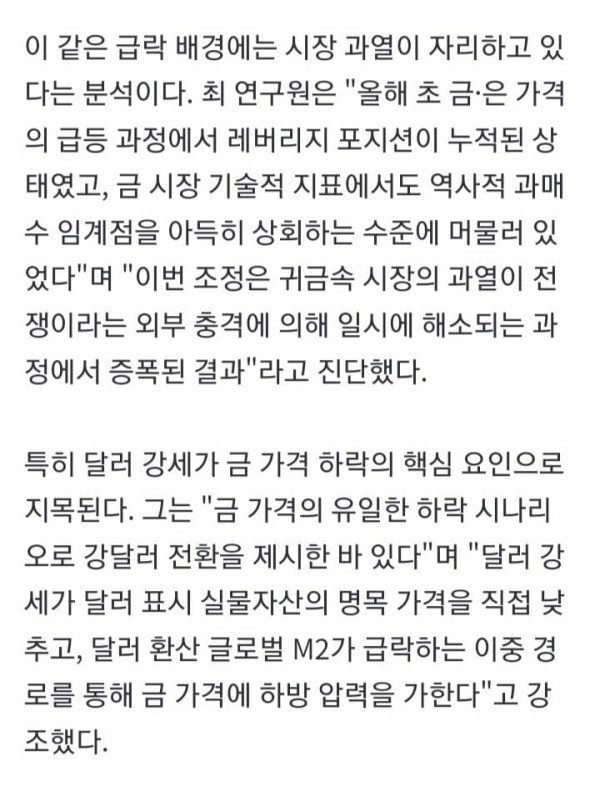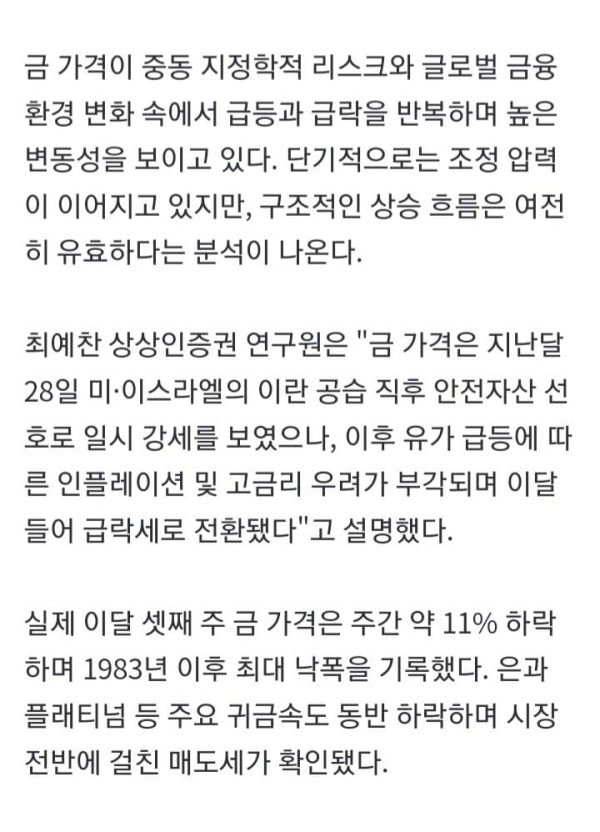 금 가격이 중동 지정학적 리스크와 글로벌 금융환경 변화 속에서 급등과 급락을 반복하며 높은 변동성을 보이고 있다. 단기적으로는 조정 압력이 이어지고 있지만, 구조적인 상승 흐름은 여전히 유효하다는 분석이 나온다. 최