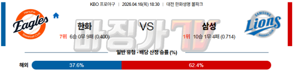 2026-04-16 KBO 한화 삼성 KBO/NPB분석 무료중계 스포츠분석