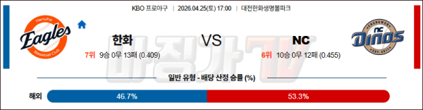 2026-04-25 KBO 한화 NC KBO/NPB분석 무료중계 스포츠분석