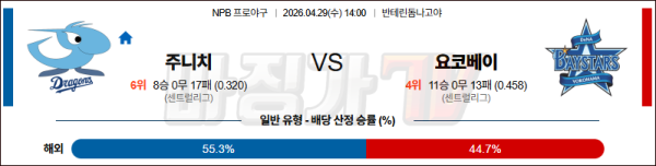 2026-04-29 NPB 주니치 요코하마 KBO/NPB분석 무료중계 스포츠분석