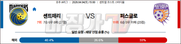 2026-04-04 호주 A리그 센트럴 코스트 마리너스 FC 퍼스 글로리 FC 해외축구분석 무료중계 스포츠분석