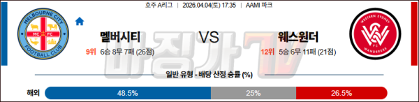 2026-04-04 호주 A리그 멜버른 시티 FC 웨스턴 시드니 원더러스 FC 해외축구분석 무료중계 스포츠분석