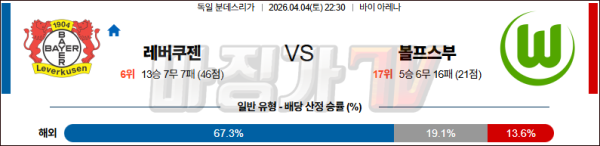 2026-04-04 분데스리가 레버쿠젠 VfL 볼프스부르크 해외축구분석 무료중계 스포츠분석