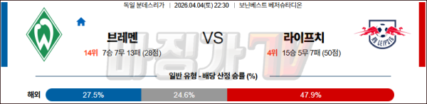 2026-04-04 분데스리가 SV 베르더 브레멘 RB 라이프치히 해외축구분석 무료중계 스포츠분석