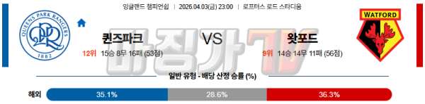 2026-04-03 잉글랜드 챔피언쉽 퀸즈 파크 레인저스 왓포드 해외축구분석 무료중계 스포츠분석