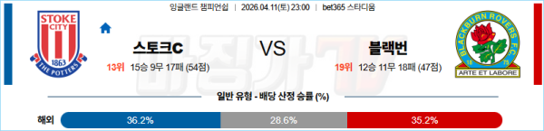 2026-04-11 잉글랜드 챔피언쉽 스토크 시티 블랙번 로버스 해외축구분석 무료중계 스포츠분석