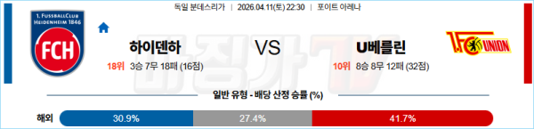 2026-04-11 분데스리가 FC 하이덴하임 우니온베를린 해외축구분석 무료중계 스포츠분석