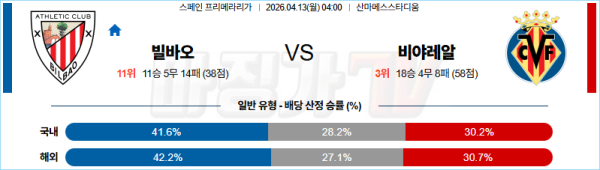 2026-04-13 라리가 아틀레틱 빌바오 비야레알 해외축구분석 무료중계 스포츠분석