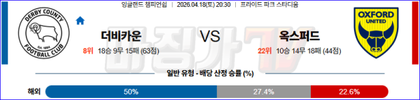 2026-04-18 잉글랜드 챔피언쉽 더비 카운티 옥스포드 유나이티드 FC 해외축구분석 무료중계 스포츠분석