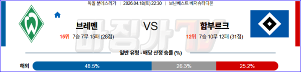 2026-04-18 분데스리가 SV 베르더 브레멘 함부르크 해외축구분석 무료중계 스포츠분석